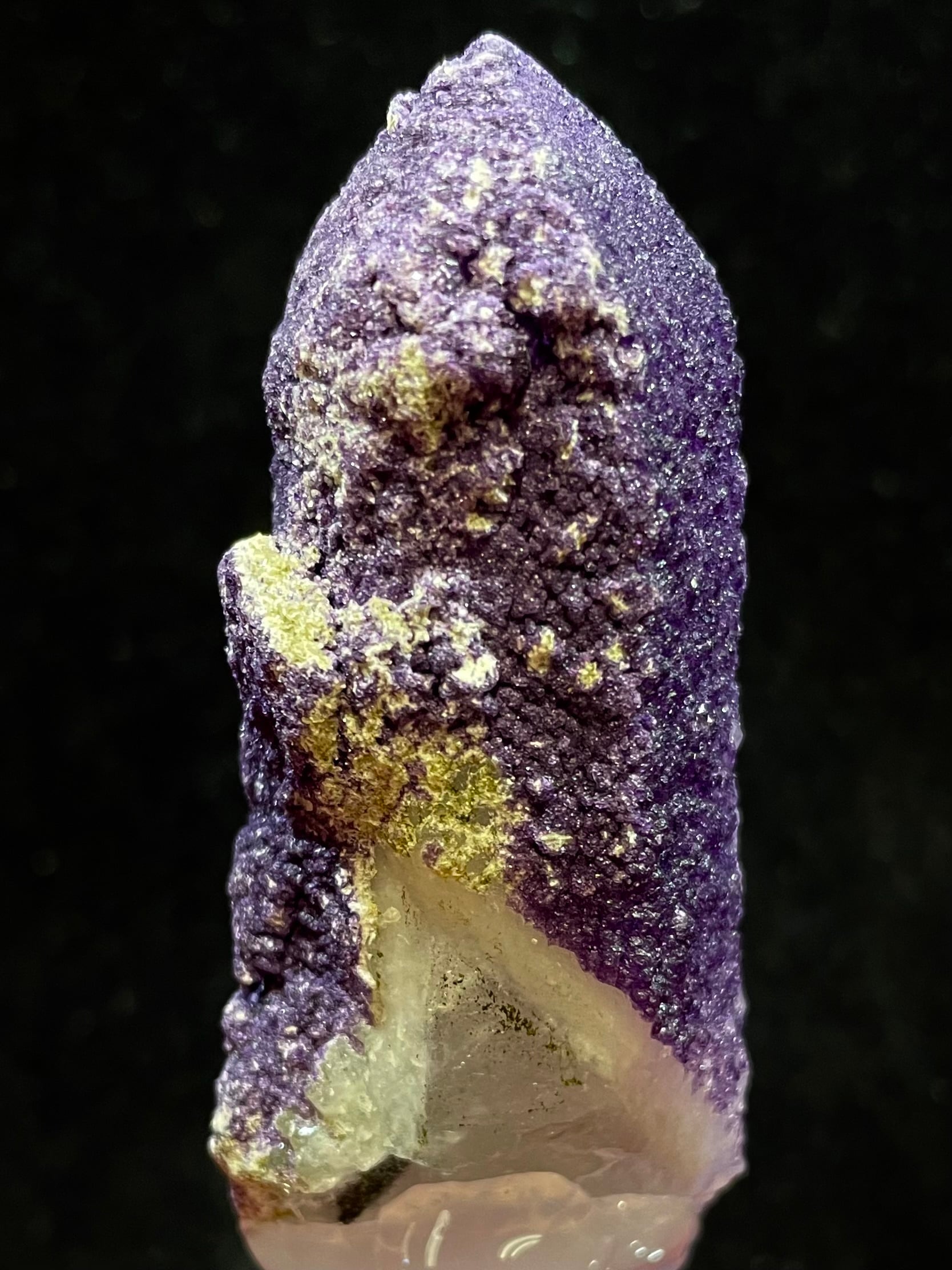 クオーツの表面にパープル・フローライトが付着している珍品中の珍品です。