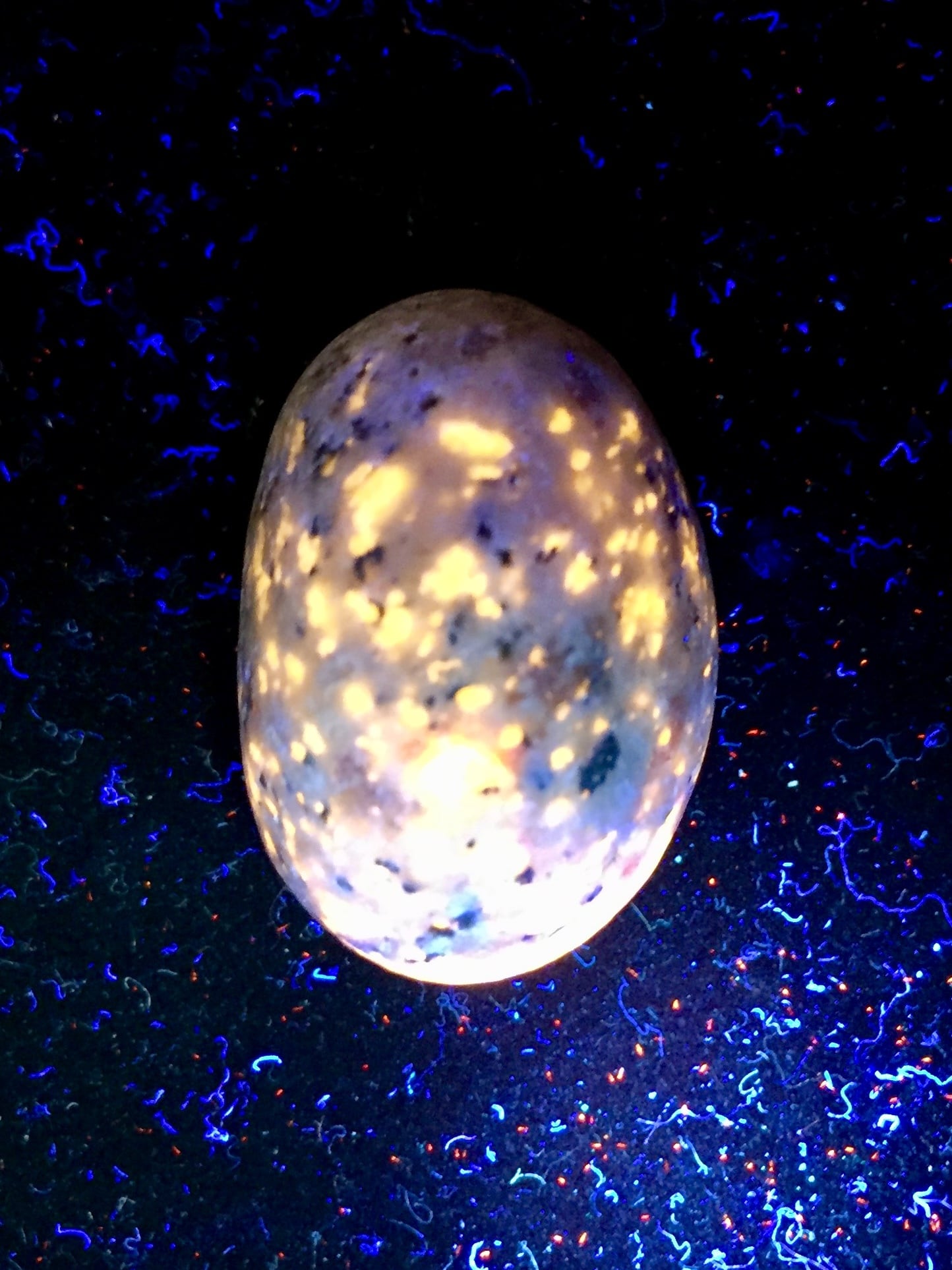 蛍光性方ソーダ石含有閃長岩(syenite clasts containing fluorescent sodalite)