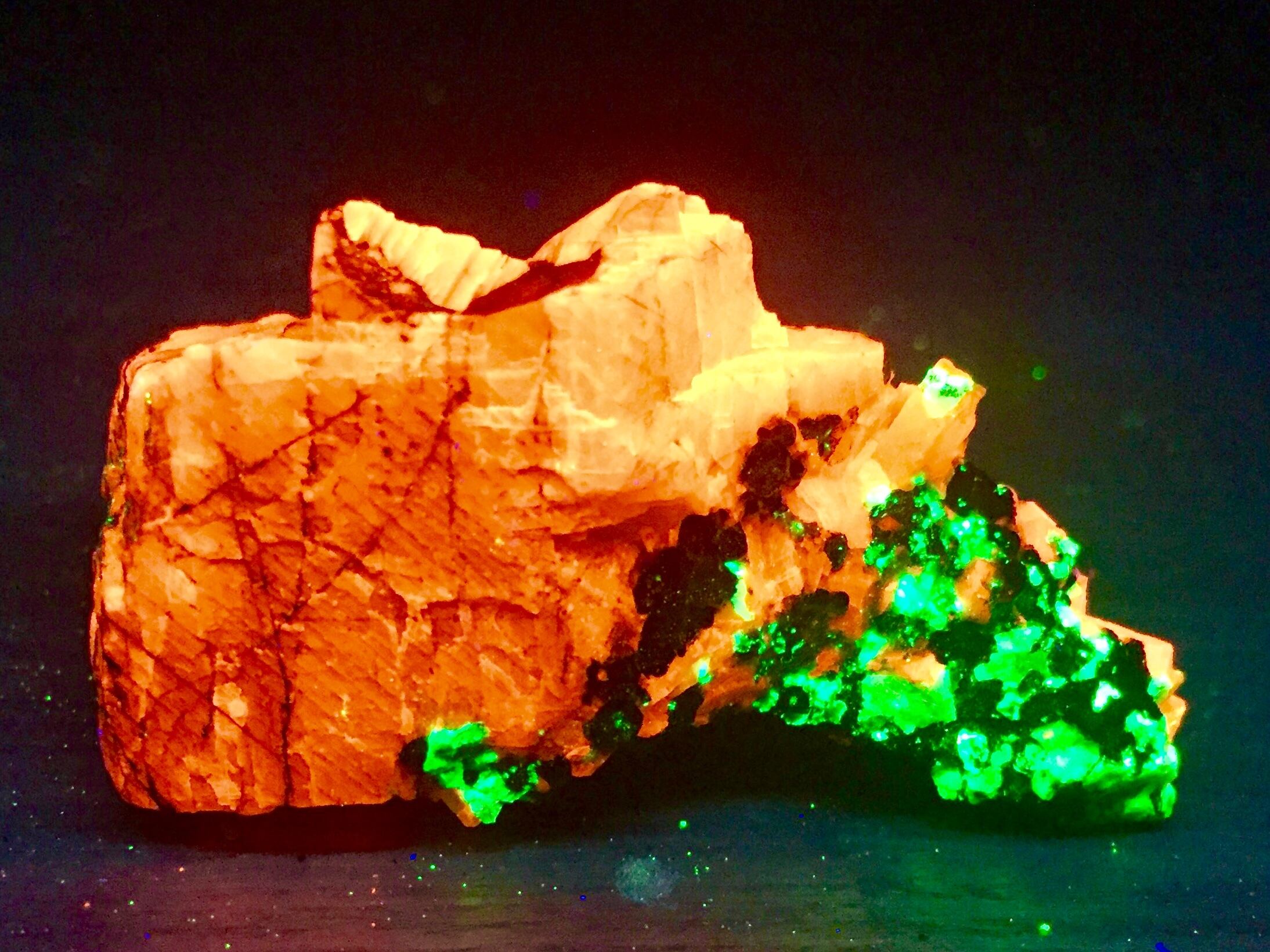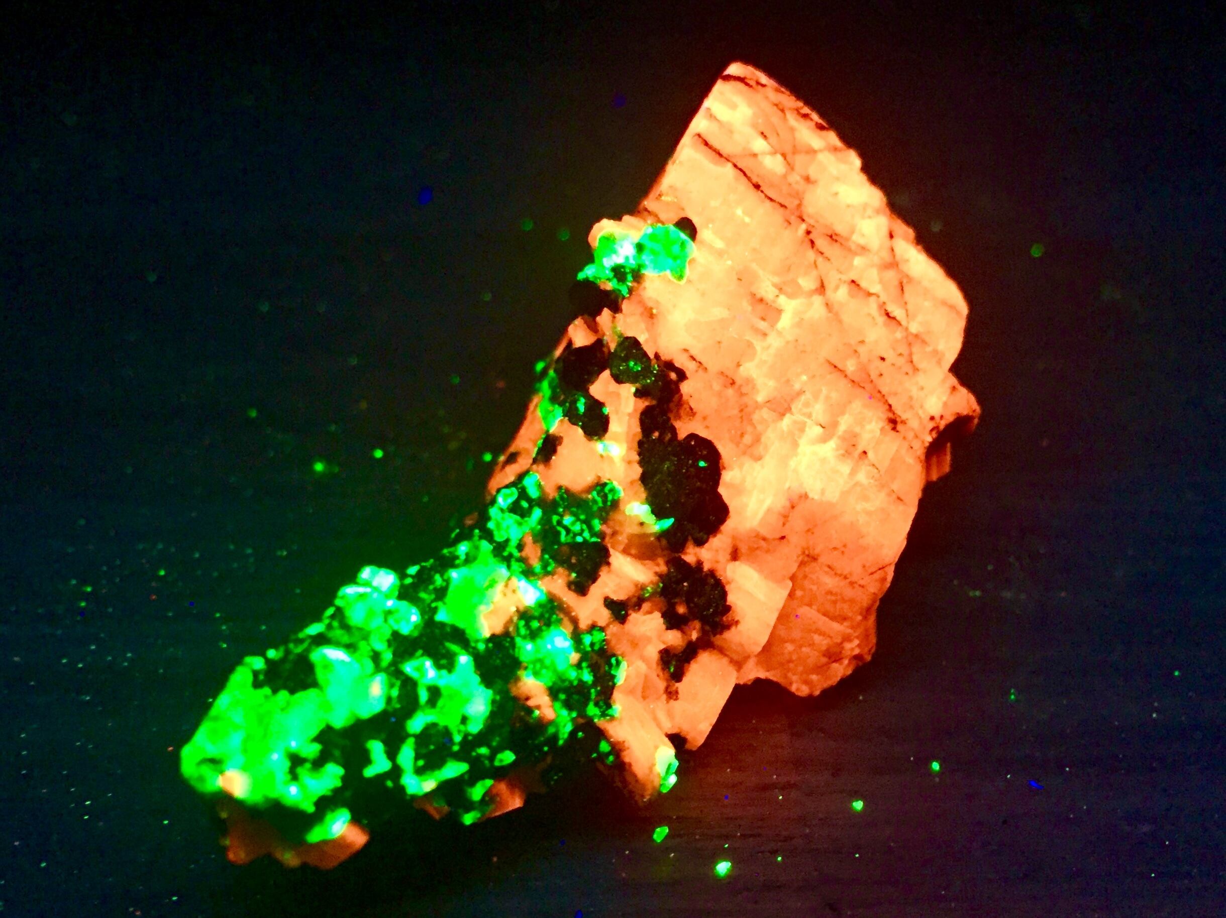 この石は紫外線の「短波」ライトを当てると想像以上の思いも寄らない「輝き」で蛍光します。
