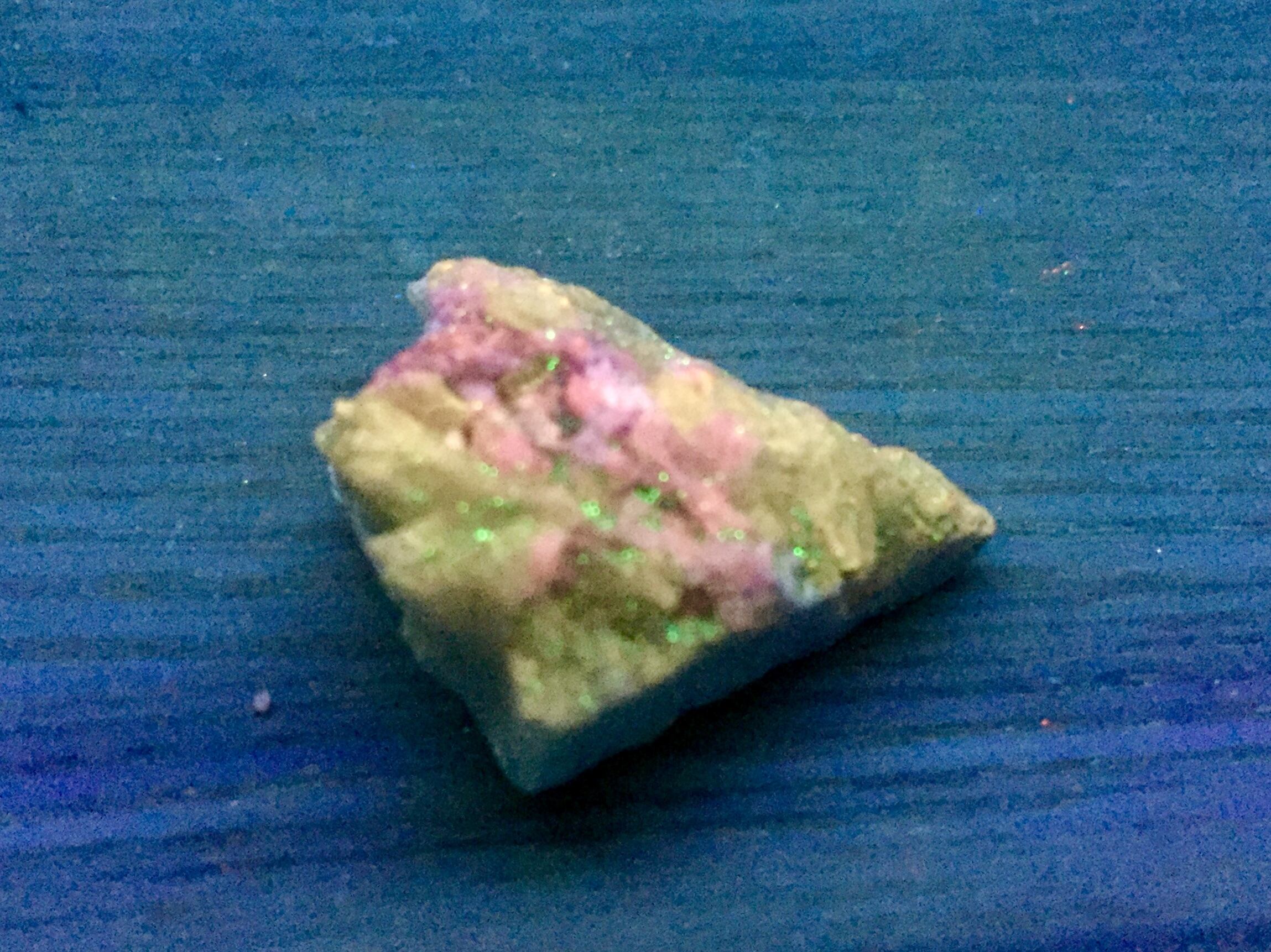 この石は紫外線の「短波」ライトを当てると想像以上の思いも寄らない「輝き」で蛍光します。