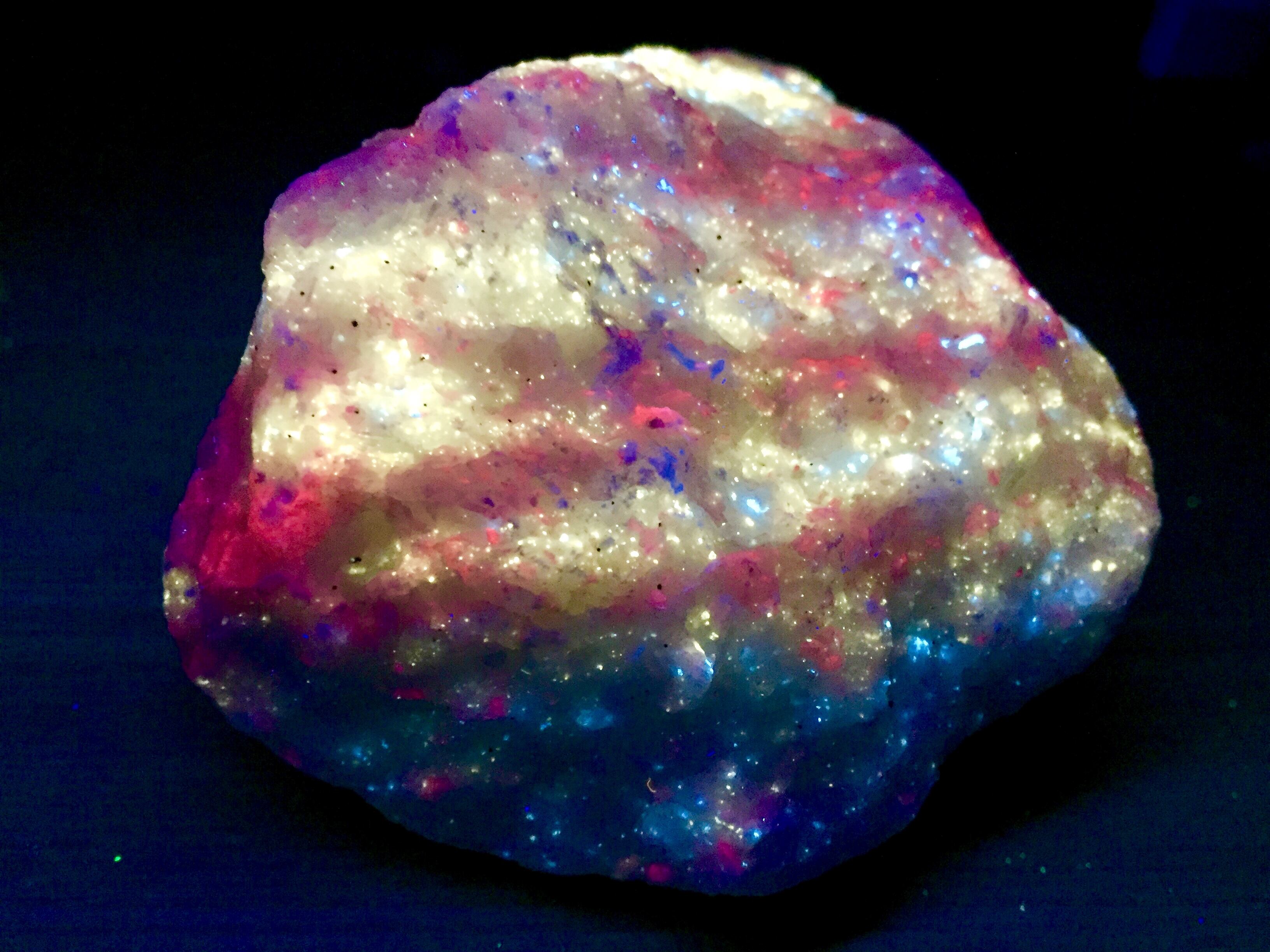 この石は紫外線の「短波」ライトを当てると想像以上の思いも寄らない「輝き」で蛍光します。