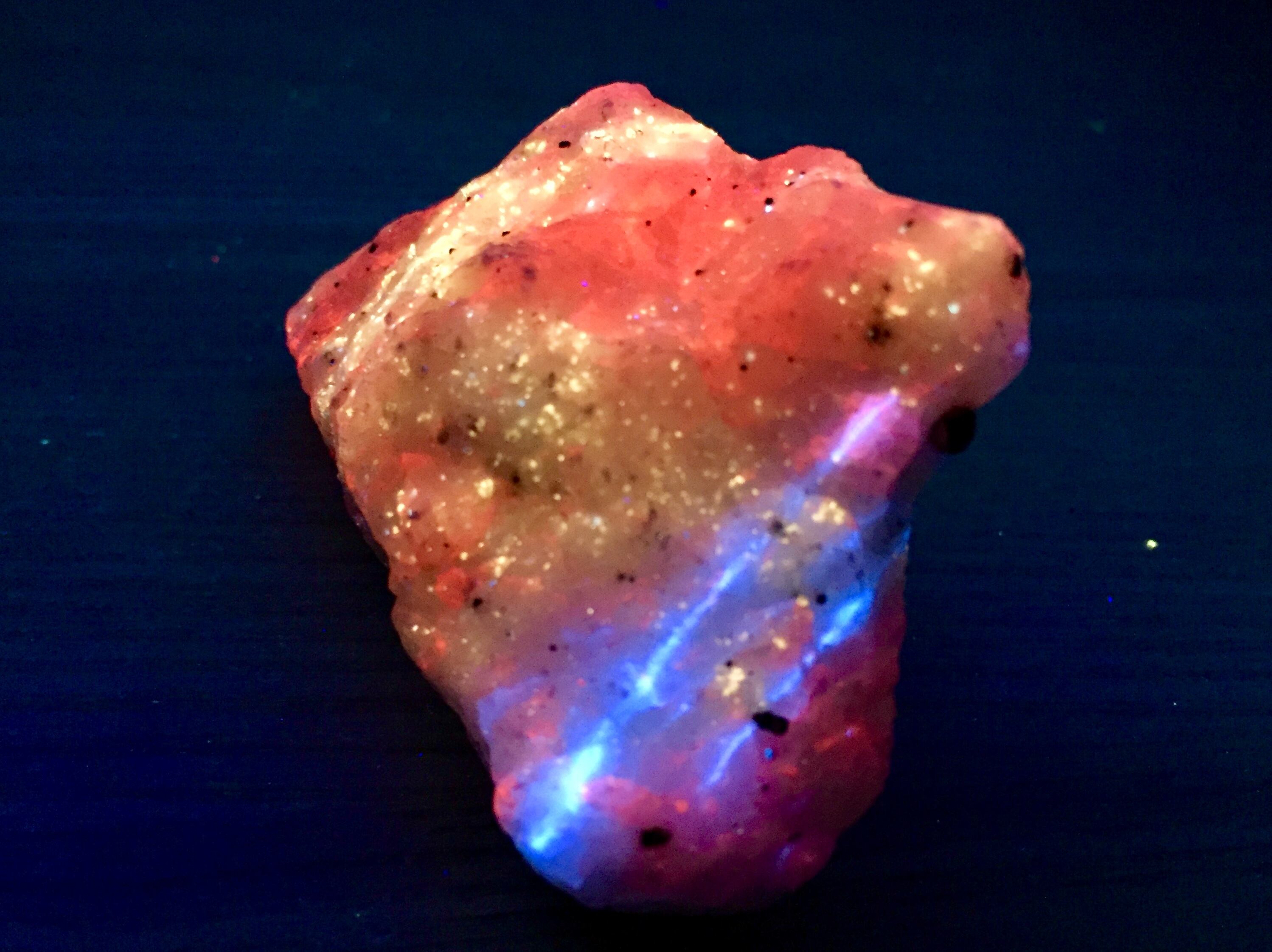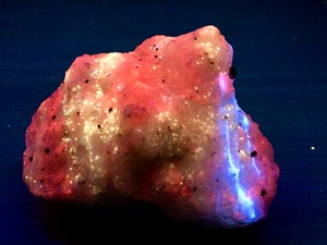 この石は紫外線の「短波」ライトを当てると想像以上の思いも寄らない「輝き」で蛍光します。