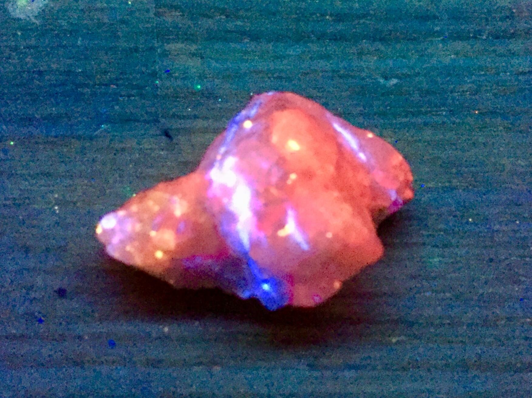 この石は紫外線の「短波」ライトを当てると想像以上の思いも寄らない「輝き」で蛍光します。