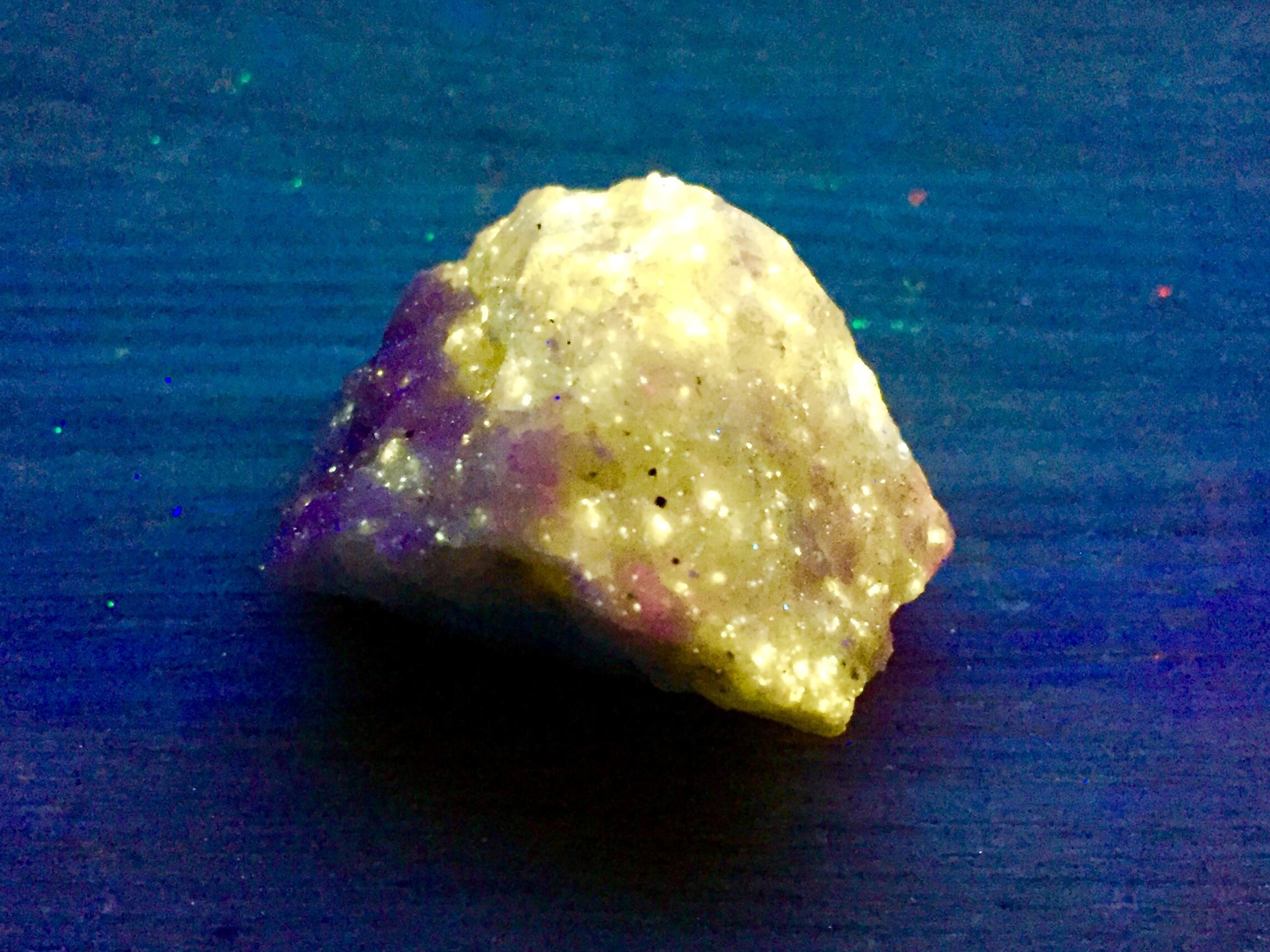この石は紫外線の「短波」ライトを当てると想像以上の思いも寄らない「輝き」で蛍光します。