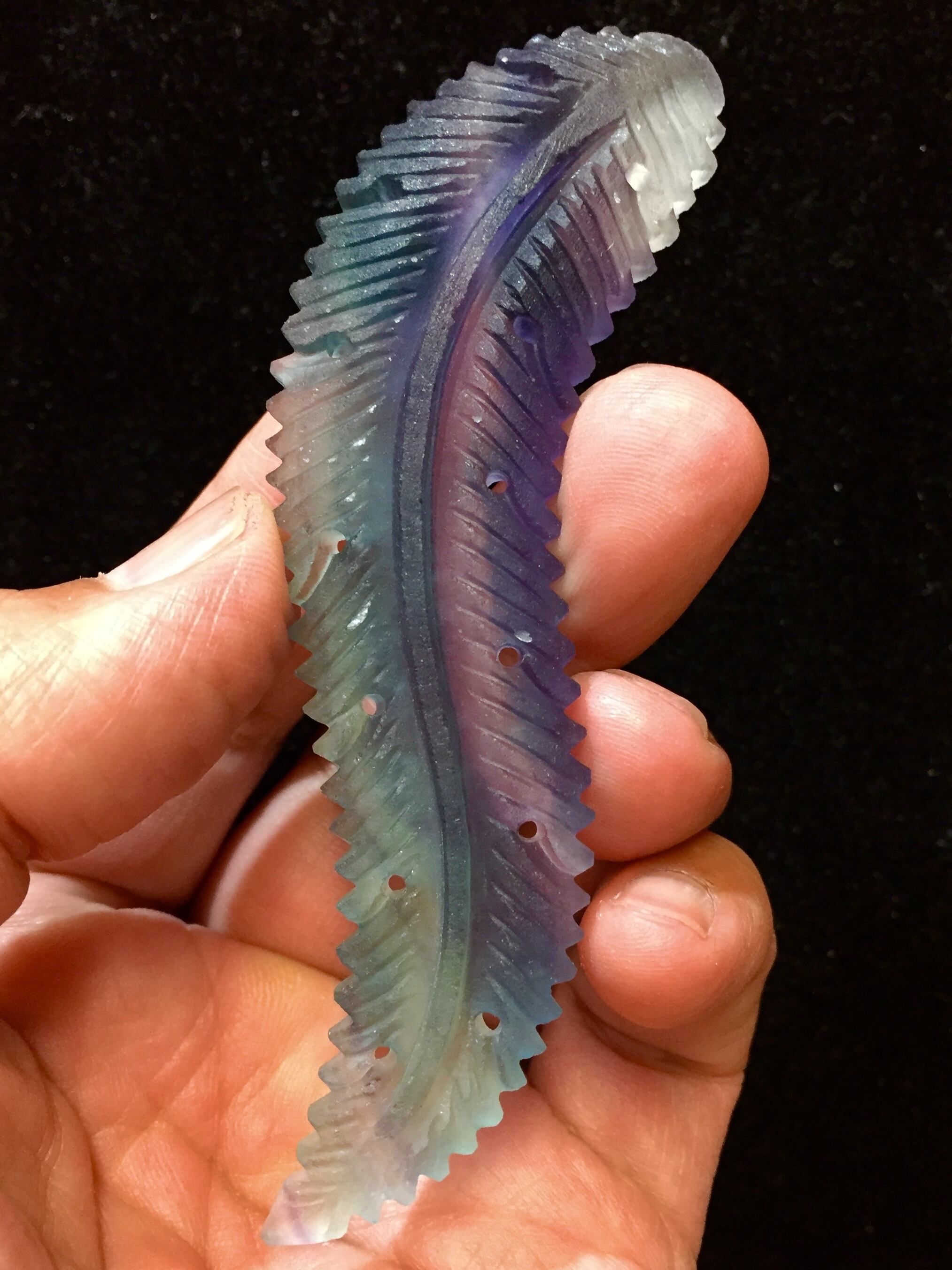 羽根の形に手彫りされた、大変綺麗なレインボー・フローライトです。
