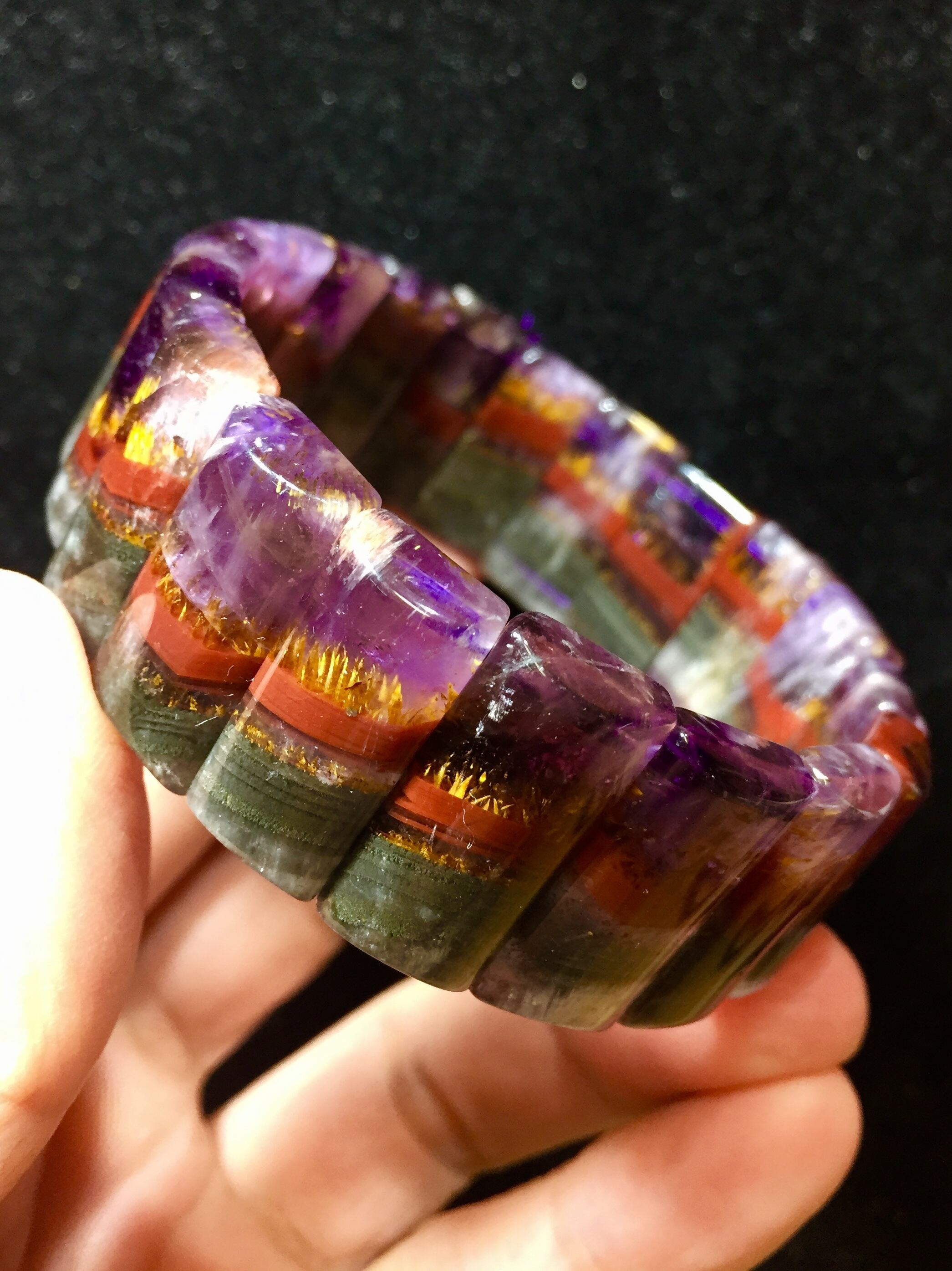 7〜8層のカラーで構成されており、カコクセナイト、アメジスト、プラシオライトなど様々な鉱物が入り込んでいます。