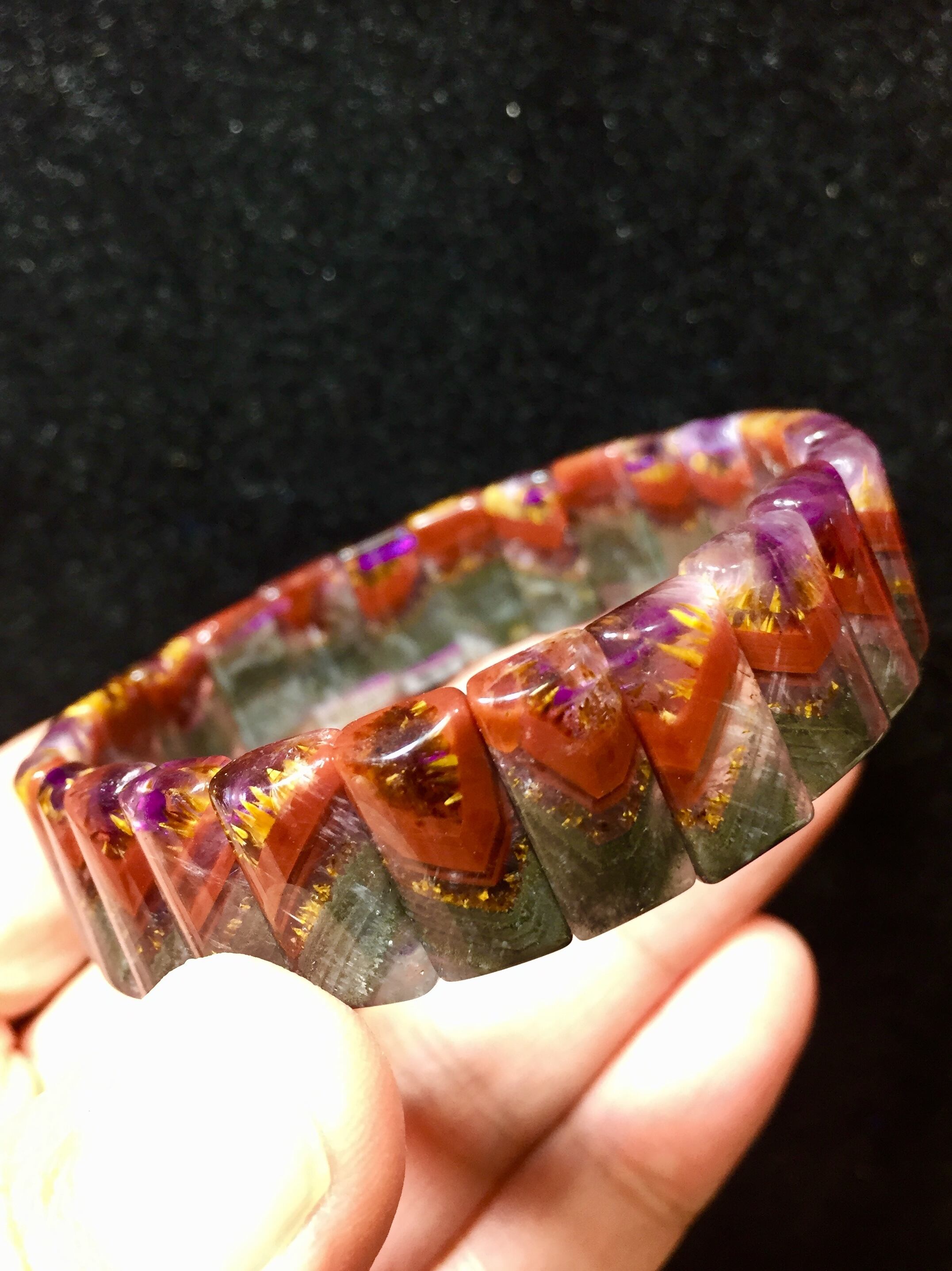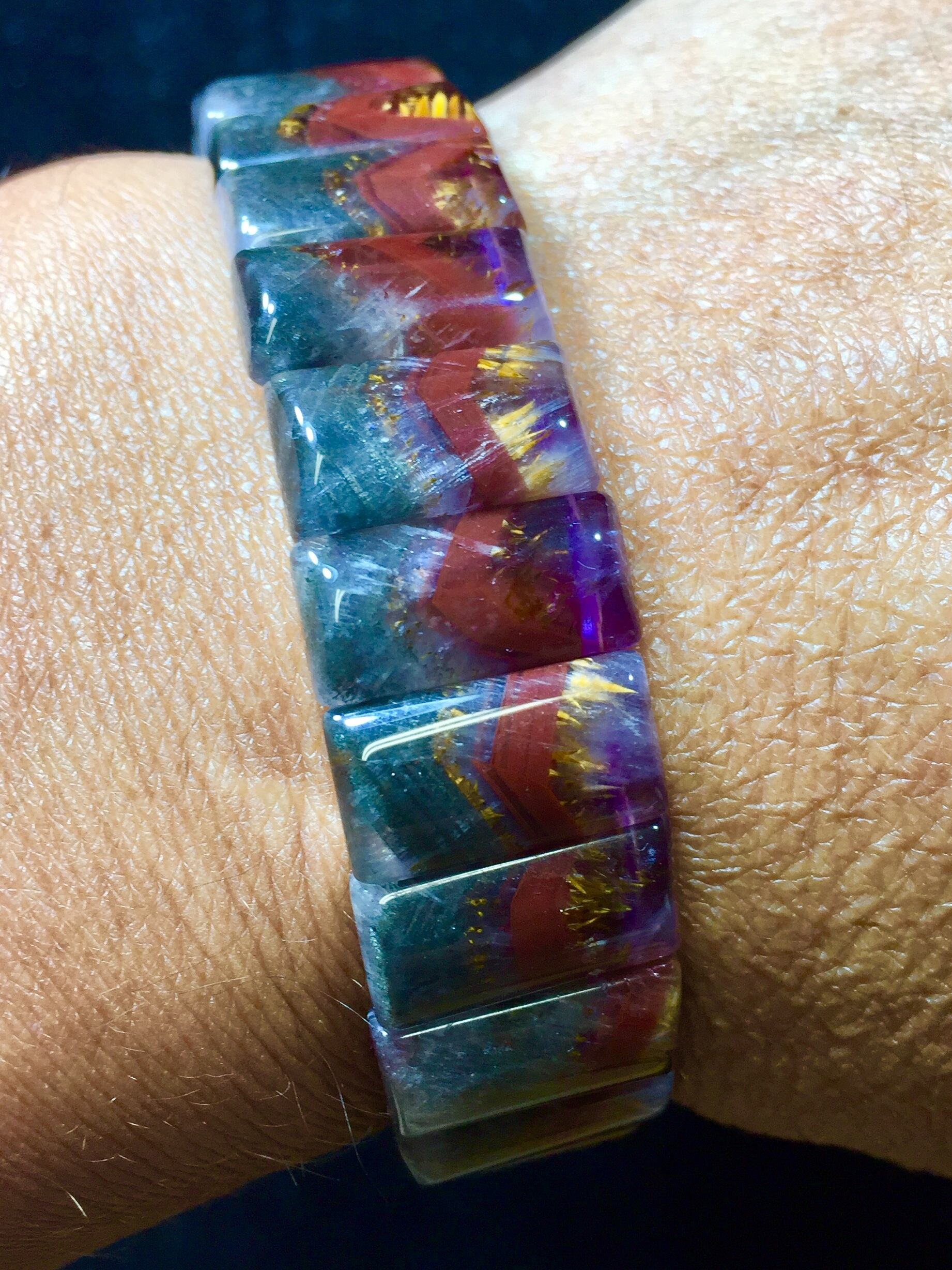 7〜8層のカラーで構成されており、カコクセナイト、アメジスト、プラシオライトなど様々な鉱物が入り込んでいます。