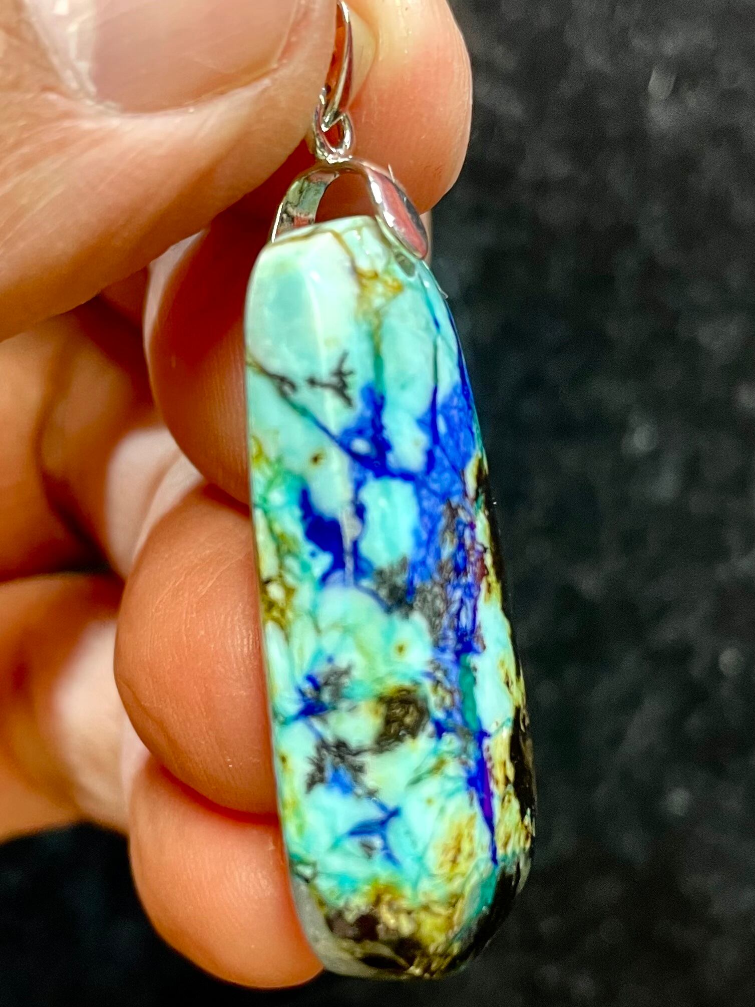 銅の産地で採れる石であるため、酸化した緑青の色が鮮やかなペンダントです。