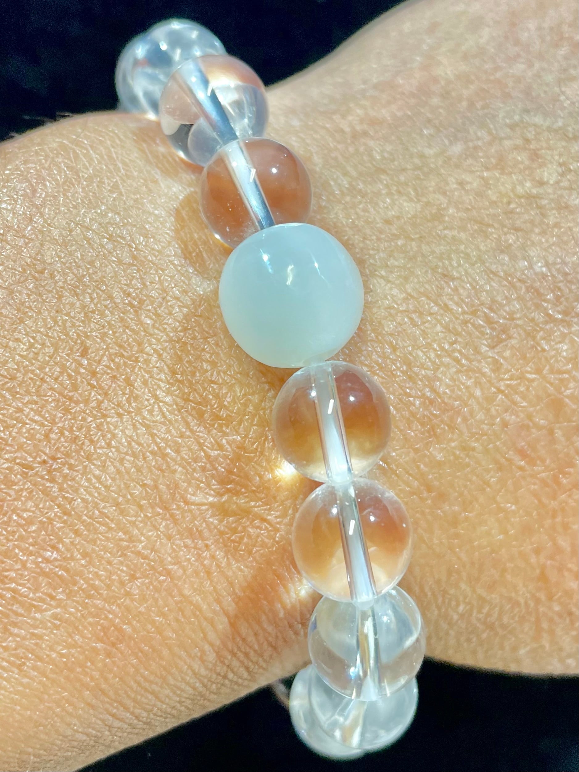 「ミラクル・ケオン」と、シャンデリアなどにも使われるハイクオリティのシャンデリアクオーツから作られたビーズのコラボレーション・ブレスレット。