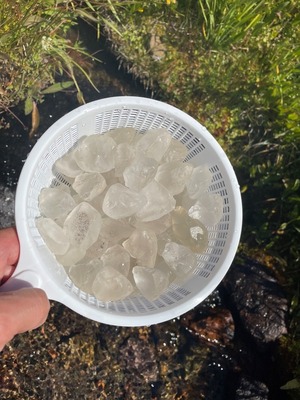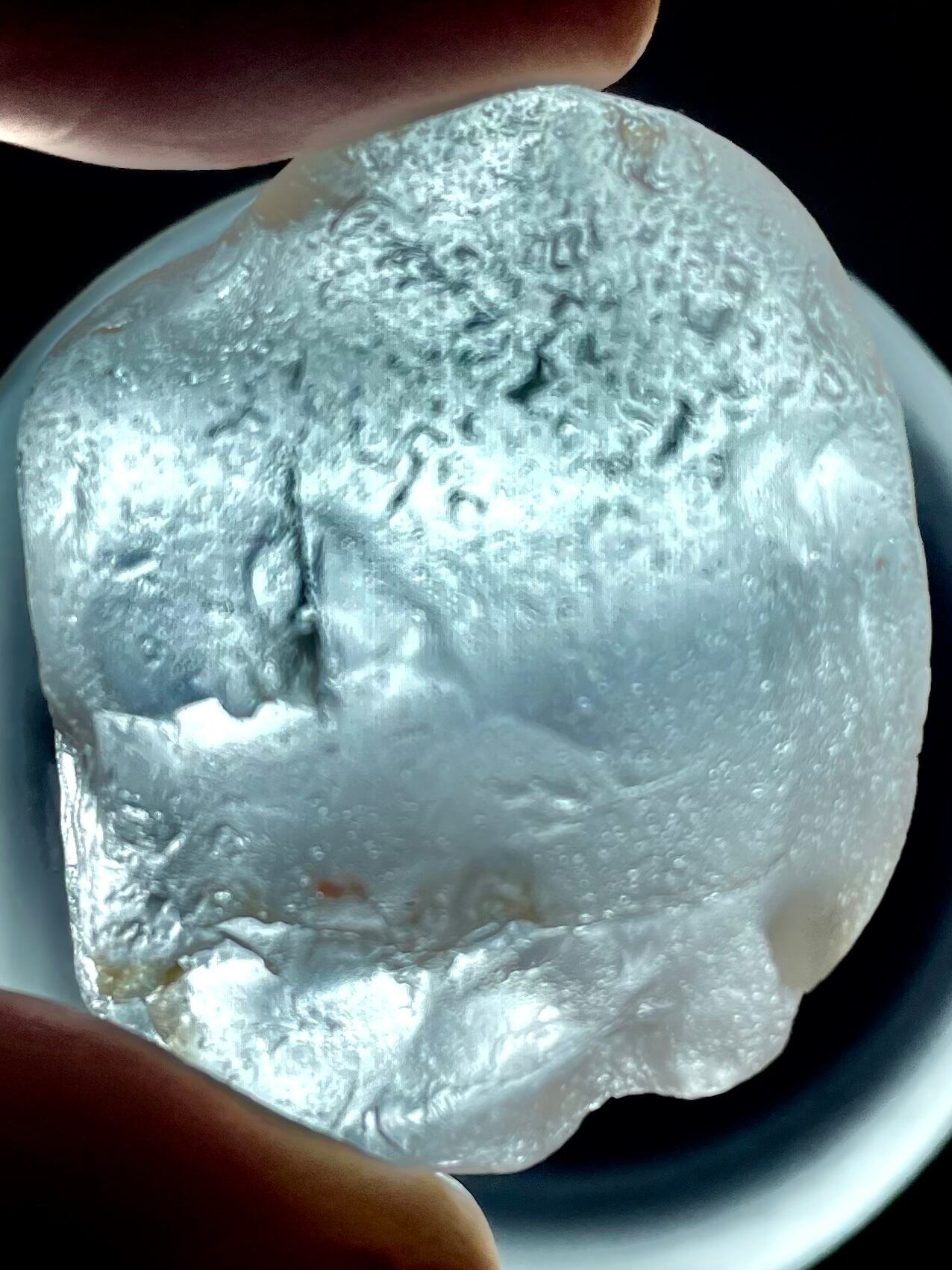 ダイヤモンドや金の鉱床が上流にある川で、川底の窪みに入り込んだ水晶が窪みの中でコロコロ動いているうちに丸く角が取れ、流れて来るダイヤモンドや金と一緒に堆積され(比重の重いダイヤモンドや金は下の方)、長い年月が経ち、川ではなくなり、土で覆われた状態になっても、元々が川であったため、水分が多いその土地に落雷が起きる事で、その高熱により表面が溶けた雷水晶になります。