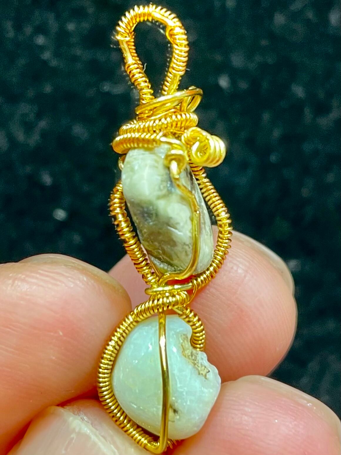 しかし、この2つを併せたペンダントにより、強力なクリアリングが必要な時はボルテックス・ストーンがまず働き、その後に穏やかな新生オパールが作用する、強烈なクリアリングでは刺激が強過ぎる時は、まず穏やかな新生オパールが作用し、その後にそれを強力に後押しする型でボルテックス・ストーンが働く、という都合良く有益に協力し合う大変特殊なペンダントトップになっています。