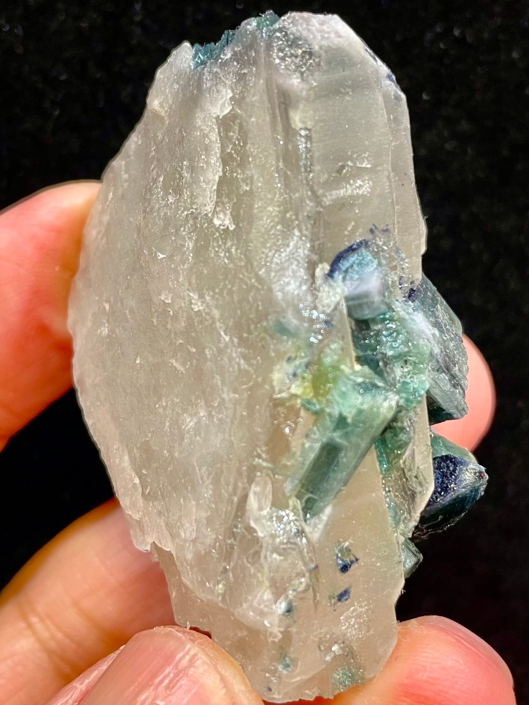 採掘量が極端に少ないインディゴライト(ブルートルマリン)が中と外に共生しているクリスタル。