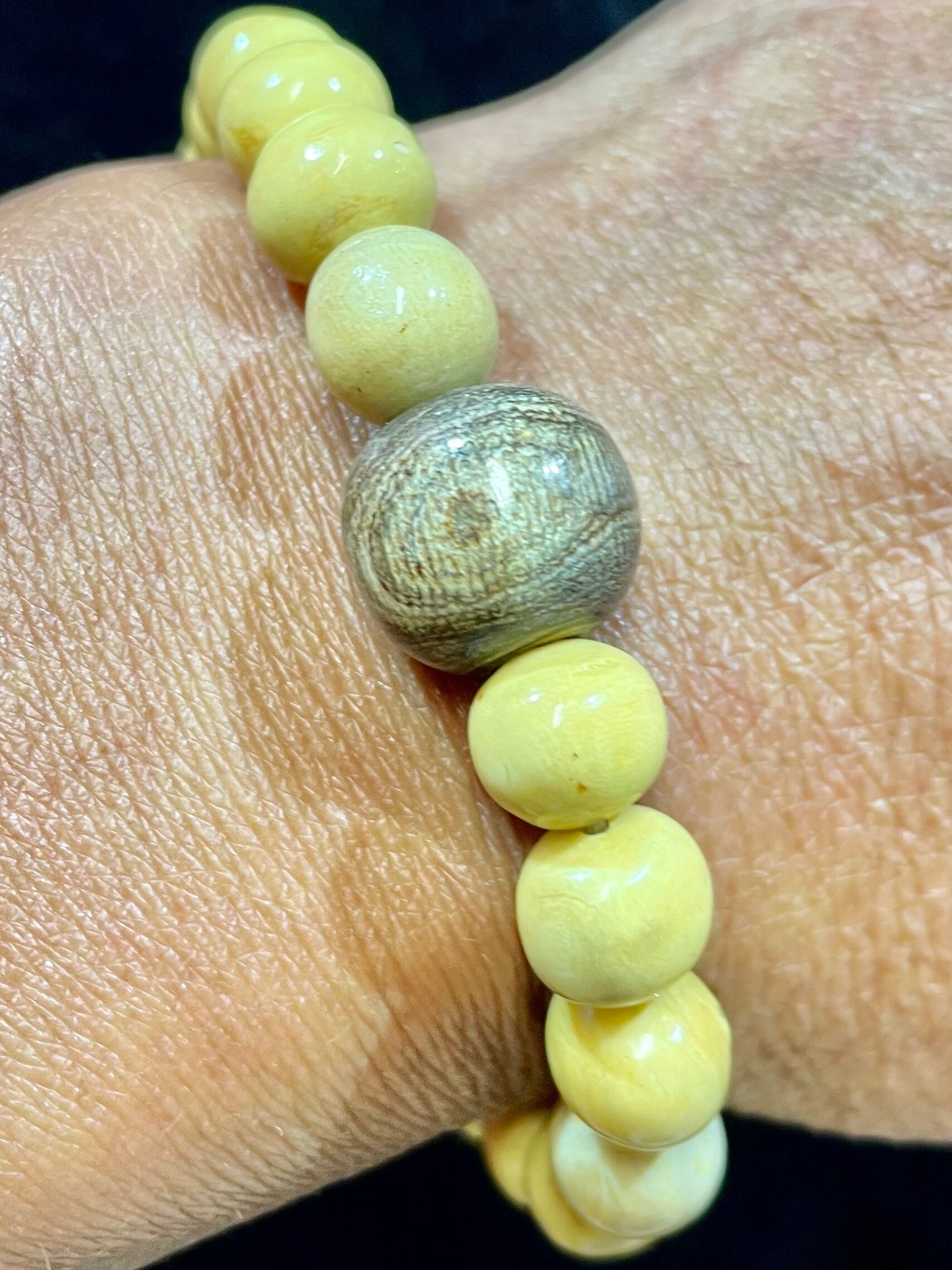 インドネシアの聖なる石「ホワイト・ケオン」が寄生する、1000年以上経過したドーム型珊瑚の上で成長し何億年も掛けて化石化した希少石。そのため、ホワイト・ケオンとの相性は抜群。
